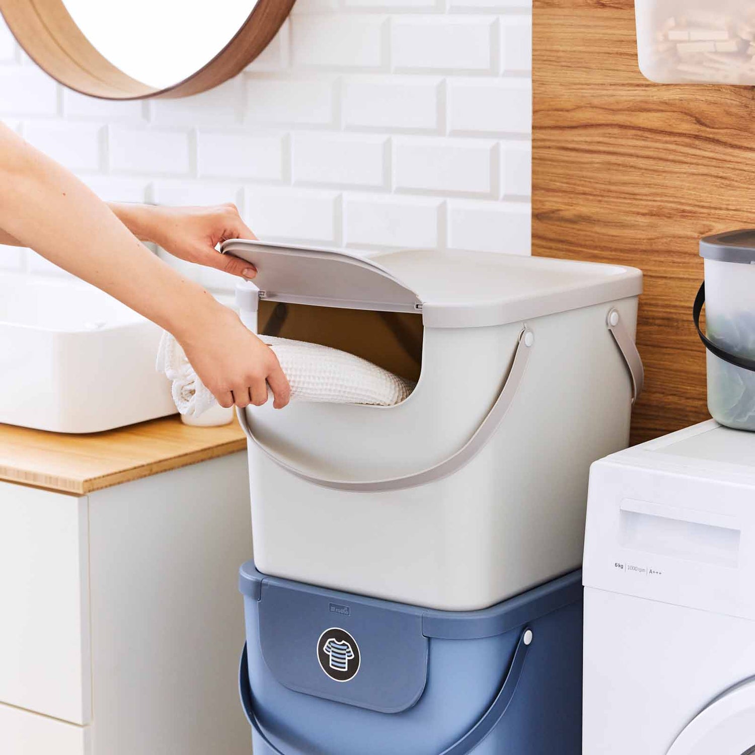 Unsere designorientieren Boxen ALBULA - neu auch als zeitloses System zur Wäschetrennung. Dank der bewährten Modularität können mehrere Boxen platzsparend aufeinander gestellt werden. Die bequemen Griffe erlauben ein einfaches Tragen, auch bei schwerem Inhalt. Neun verschiedene Sticker können auf die frontale Klappe des Deckel geklebt werden und helfen so bei der Sortierung der Wäsche. Dank des pflegeleichten Kunststoffes können die Boxen aussen sowie innen ganz einfach gereinigt werden.