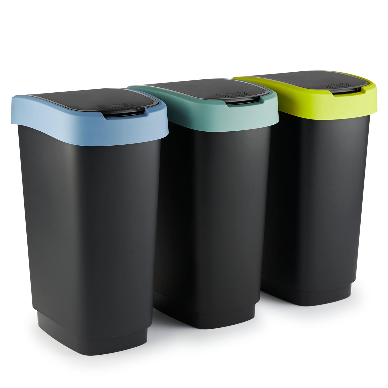 Die schlichten und platzoptimierten Eimer TWIST mit dem praktischen Deckel. Der Deckel des TWIST verfügt über zwei Öffnungsmöglichkeiten: Eine Swingeimer Öffnung mittig oder der Klappdeckel mit kompletter Öffnung. Die schmale, eckige Form ermöglicht platzsparendes Müllsammeln. Dank der verschiedenen Farben und Grössen und der mitgelieferten Sticker können die Eimer ideal als Recycling-Center genutzt werden. Durch den breiten Deckelrand lassen sich Mülltüten elegant verdecken.