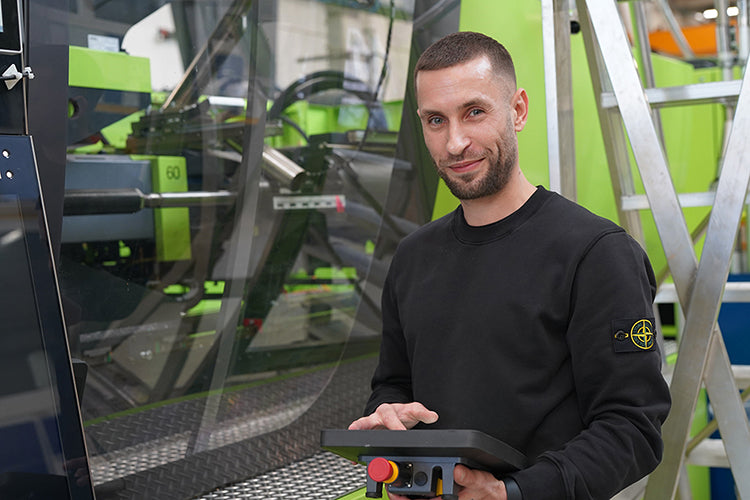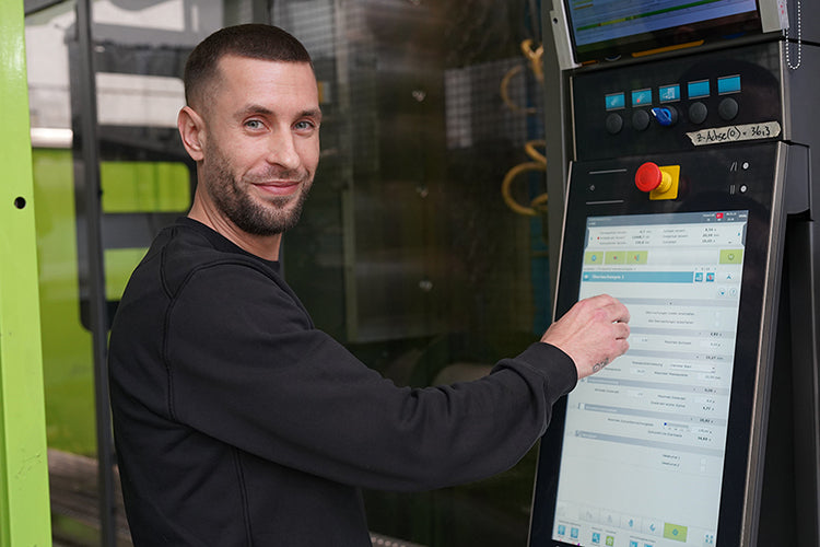 Gerade bei nachhaltigen Produkten müssen wir enorm anpassungsfähig sein. Das rezyklierte Rohmaterial, zum Beispiel unser eigener Ausschuss, der wiederverwendet wird, ist immer unterschiedlich in der Zusammensetzung und muss entsprechend verarbeitet werden.