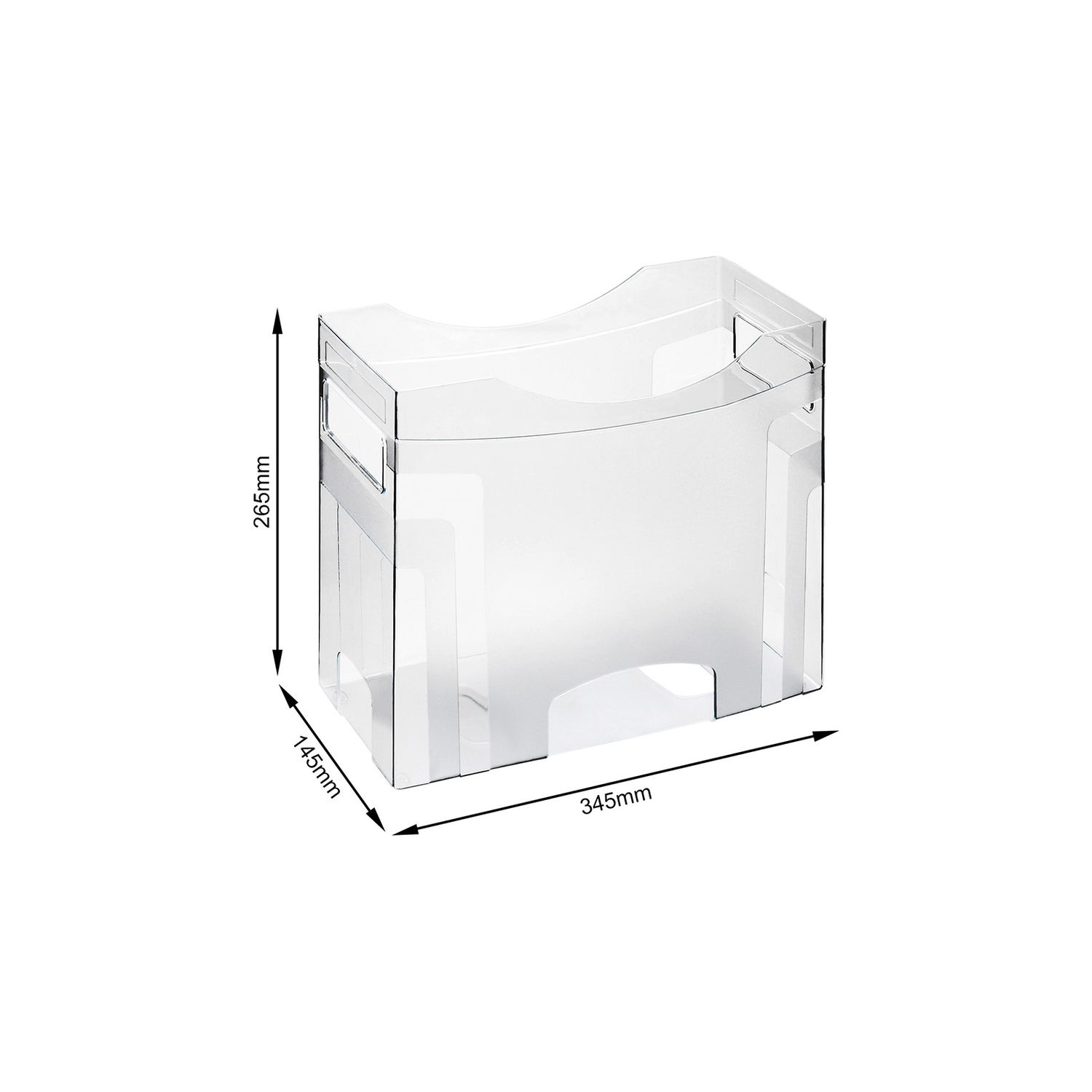 Suspension files are ideal for storing documents that are frequently needed in everyday office life. But as the number increases, it often becomes a challenge to organize these folders in a clear and space-saving manner. The CUBE suspension file box protects you from tiresome searches and helps you get the daily flood of paper under control. A surprising number of suspension files can be neatly stored in a very small space. Thanks to the transparent material, you always have a good view of the contents of the box. If necessary, the suspension file box can be easily stored in boxes and cupboards. However, thanks to its linear design, it is also very attractive when it is free-standing and thus contributes to an orderly, motivating work environment.