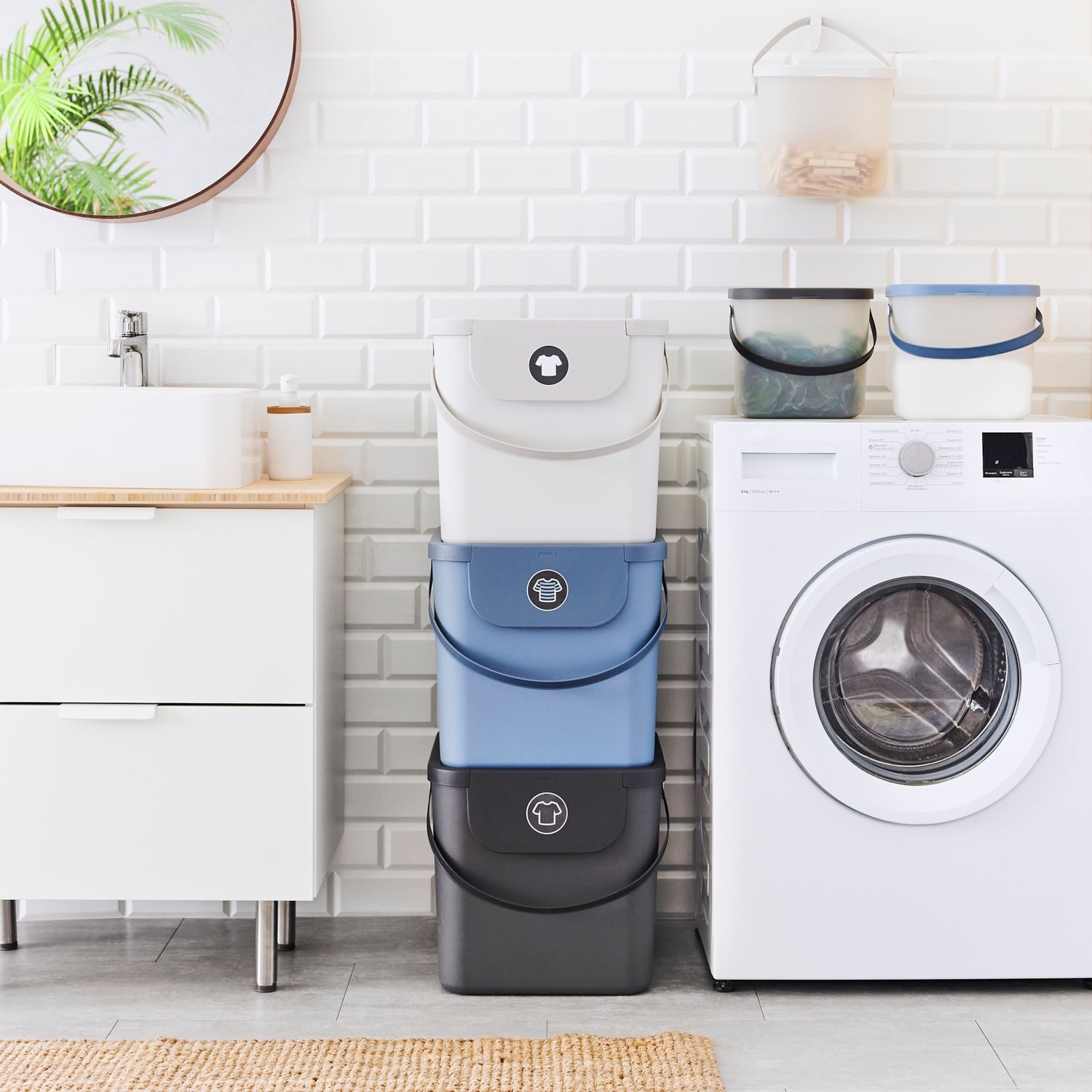The laundry basket with lid allows you to easily separate dirty laundry. The plastic buckets are available in different colors and can be opened easily even when stacked on top of each other. The handles also make it easy to transport the laundry box, for example to take the contents to the basement or to the laundromat. They are easy to clean with water and dish soap.