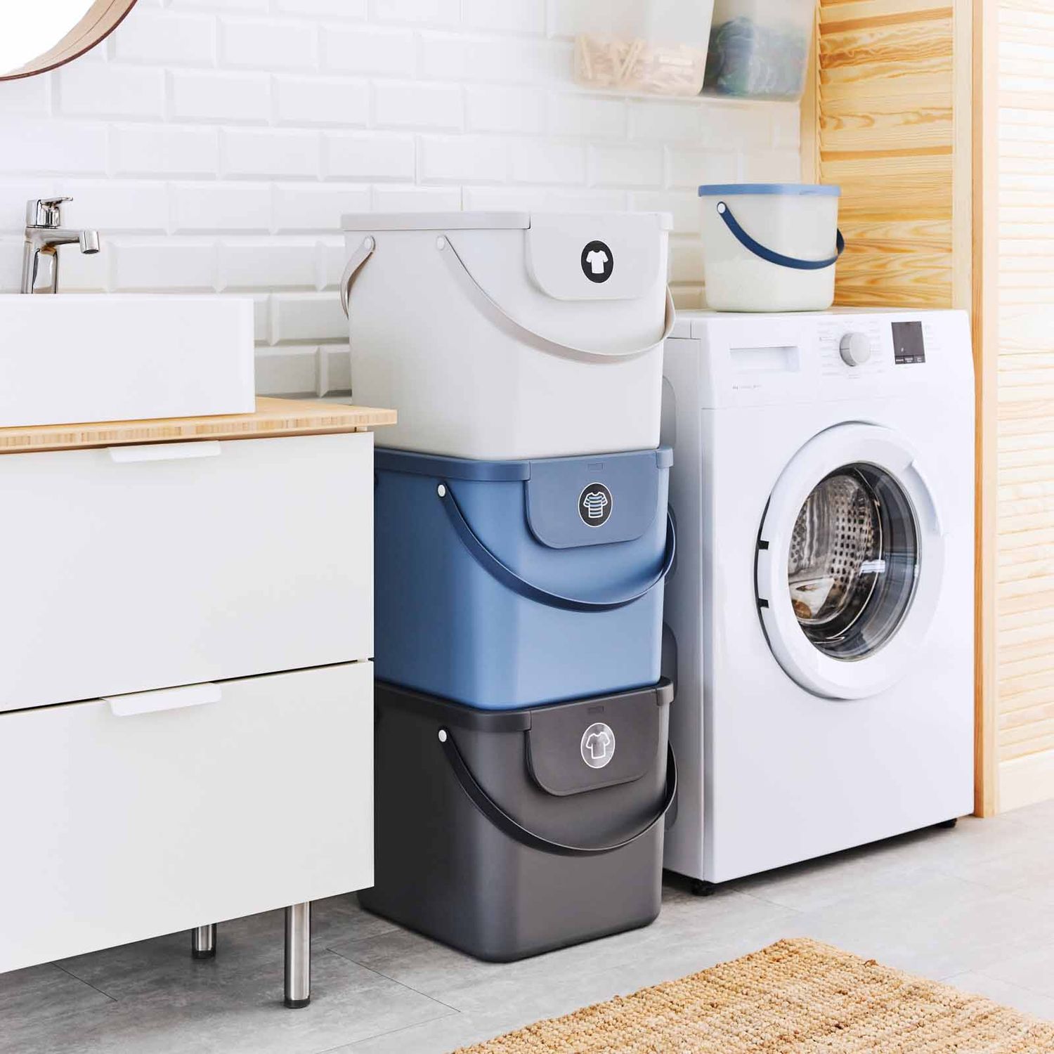 With the well thought-out laundry sorter, you can see at a glance what belongs in which laundry collector. This is ensured by the stickers that are supplied and can be attached to the front of the lid. A quick look at the box is enough and you know where e.g. that belong to 30 degrees or colored laundry. With our laundry collector you get a box for every purpose. Albula consists of recycled plastic and impresses with its robust workmanship. Each bucket has a capacity of 40 liters. Thanks to the lids, the boxes can be closed well so that no odors escape to the outside.