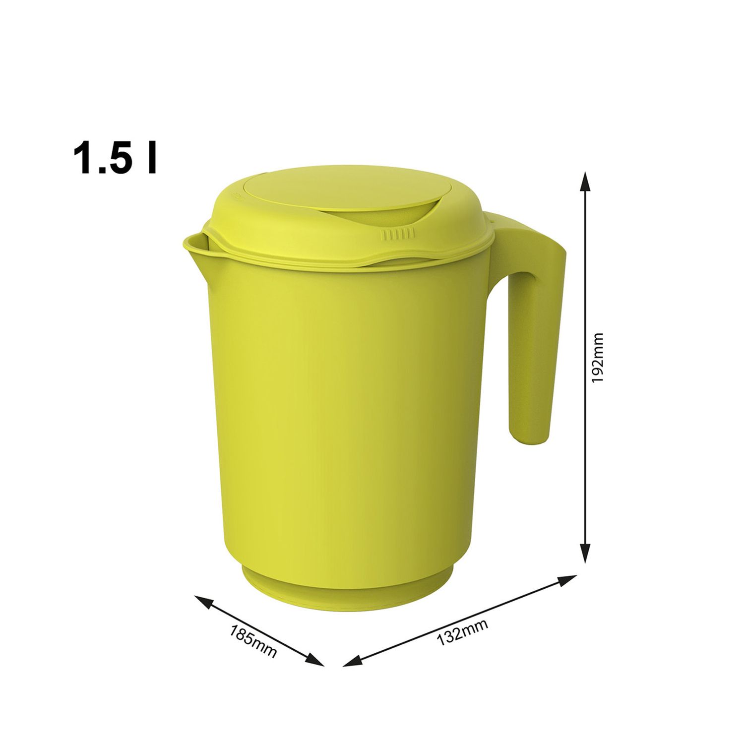 Le couvercle se compose de deux parties et peut être utilisé soit comme protection contre les éclaboussures lors du mélange ou de la purée, soit comme couvercle complet. Parce que l'anneau a quatre ouvertures différentes au choix, il peut soit sceller complètement la cruche, soit filtrer le contenu. Par exemple, la glace et le citron restent dans le pichet et seule la boisson se retrouve dans le verre.