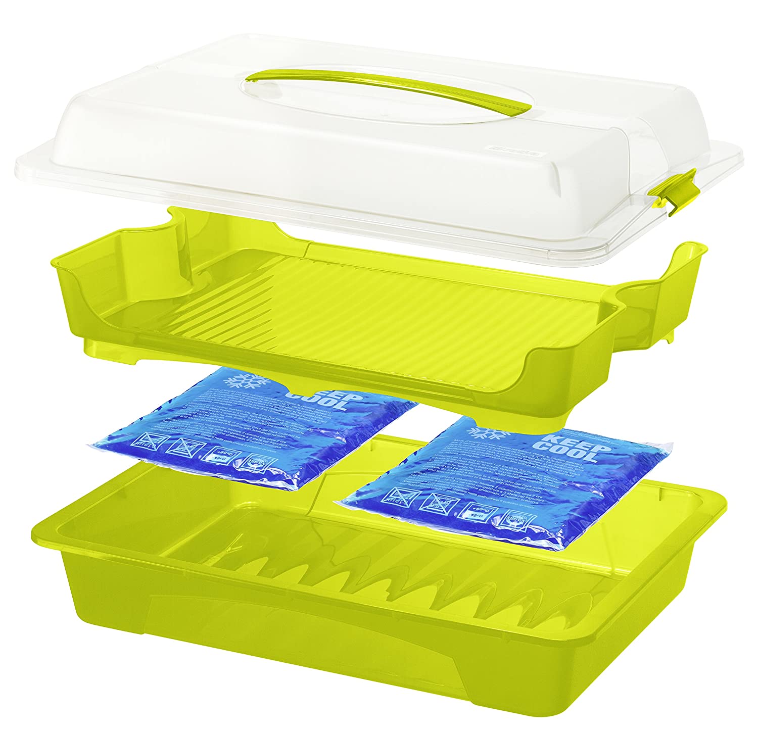 Sandwichs, charcuterie, cupcakes ou muffins ont du succès à chaque fête ou barbecue, alors c'est d'autant plus ennuyeux quand ces délices préparés avec amour sont à moitié détruits une fois arrivé à destination ! coussins réfrigérants amovibles à placer dans le congélateur au préalable - les aliments périssables restent ainsi bien réfrigéré pendant des heures. Le couvercle se ferme de manière sécure à l'aide des deux clips latéraux et la poignée ergonomique assure un transport sûr . Le plateau intégré peut être facilement retiré pour servir les collations avec élégance. Ainsi, tout reste frais, attrayant et bien goûteux . À l'air libre, le couvercle peut également servir de protection contre les insectes ou la lumière directe du soleil.