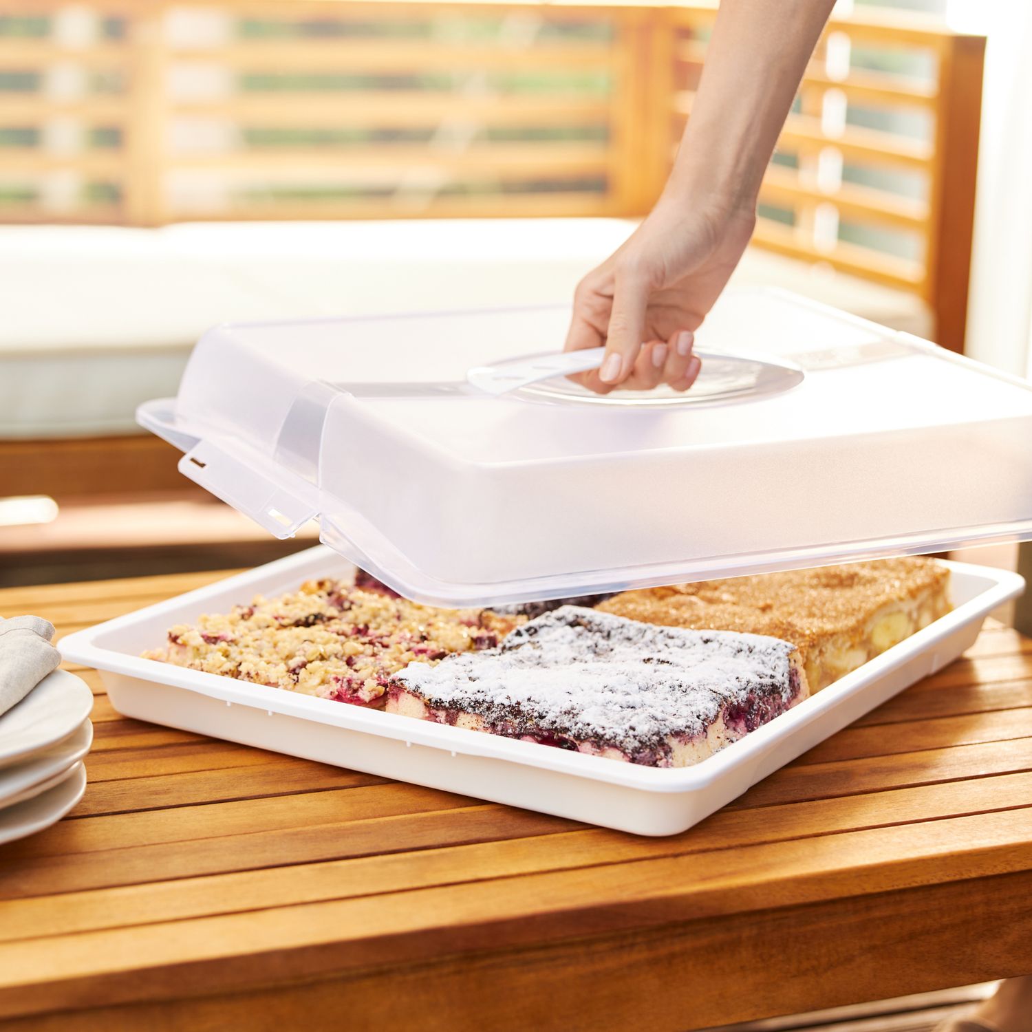 Qu'il s'agisse d'un barbecue, d'une fête d'anniversaire d'enfants ou d'un pique-nique à la campagne : vous voulez sûrement préparer des collations et délices à l'avance pour vous assurer d'une fête réussie. Mais comment les transporter pour que tout survive au voyage ? Le majordome de fête JOHN est une solution pratique et fiable pour transporter gâteaux, muffins et autres bien emballés et de manière confortable grâce à la poignée intégrée - vous n'aurez donc plus de mauvaises surprises à destination. Le couvercle transparent assure une vue claire du contenu de la boîte, mais empêche malgré tout les aliments de se dessécher. Les fourmis, insectes et autres visiteurs indésirables ne pourront plus s'approcher de la nourriture. Cuisinez et pâtissez à votre guise et impressionnez vos amis ou collègues de travail avec des délices préparés avec amour et transportés avec style !
