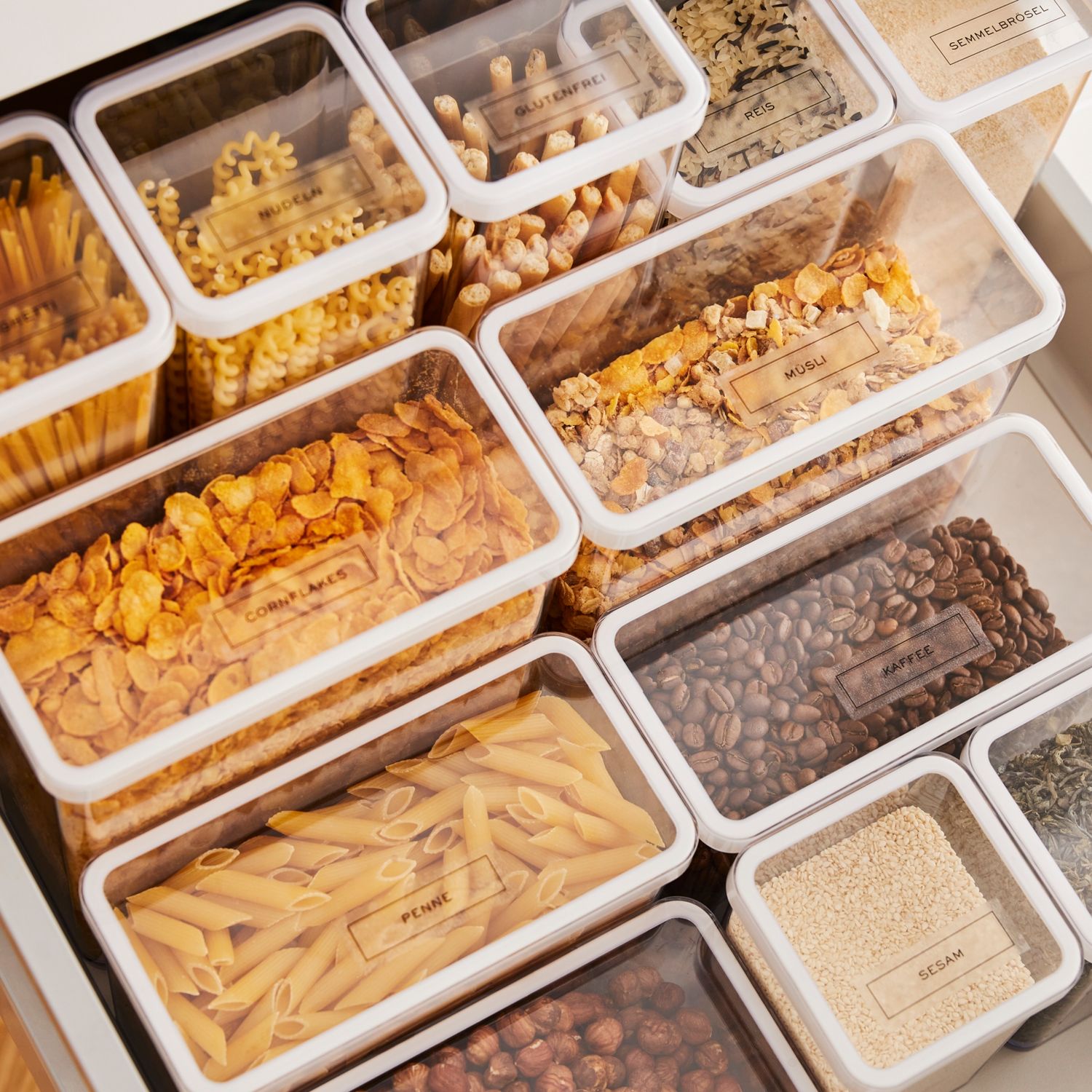 Vous recevrez 80 étiquettes pré-imprimées avec les noms les plus courants d'aliments secs pouvant être conservés dans nos boîtes LOFT, comme les pâtes, le riz, les ingrédients de cuisine et de pâtisserie, les céréales, le café et bien plus encore. De plus, 16 étiquettes non imprimées restent disponibles pour un étiquetage individuel.