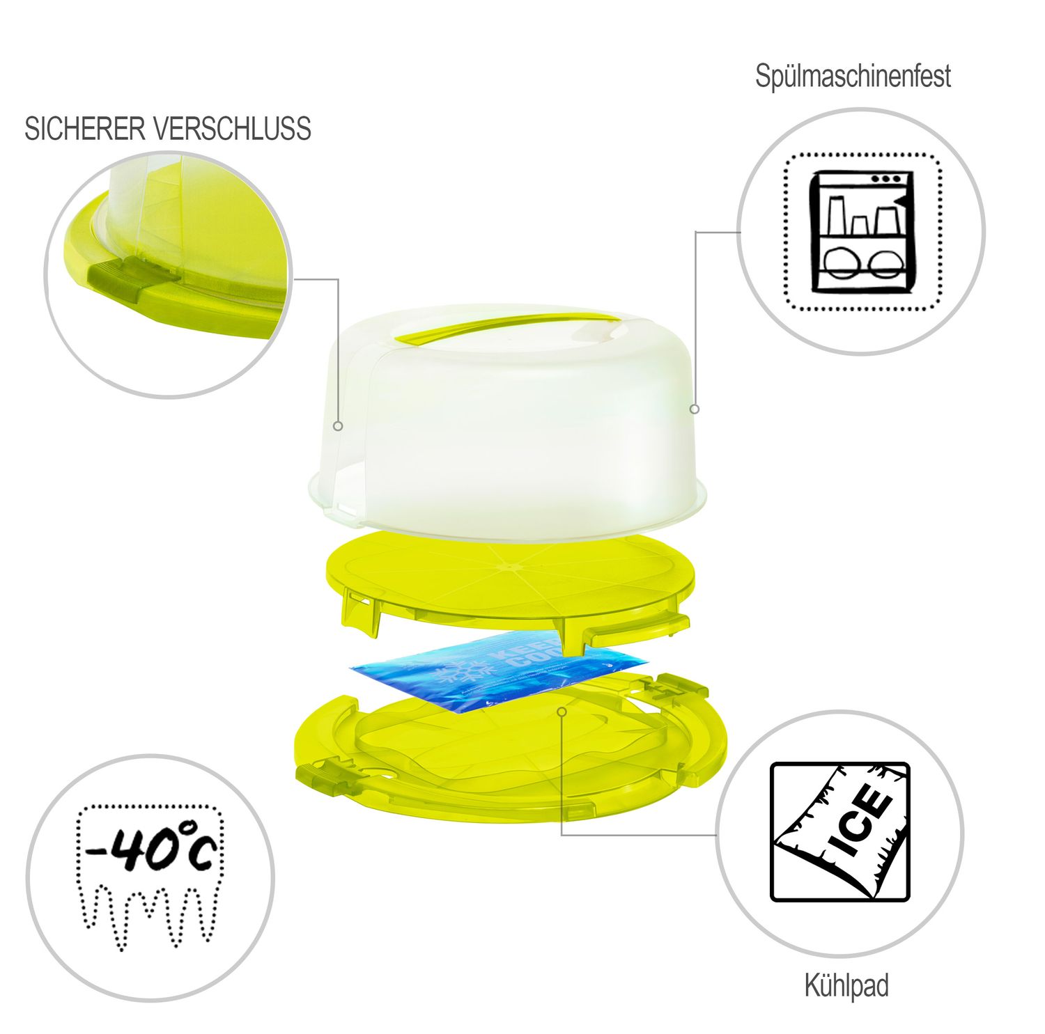Si vous cuisinez beaucoup vous-même, vous connaissez le problème : il n'y a pas que les invités qui transpirent aux températures estivales. Même les gâteaux à la crème délicats peuvent littéralement fondre sous la chaleur étouffante. Avec l'aide du dôme de gâteau COOL & FRESH, vous pouvez envoyer vos douces œuvres d'art en toute sécurité à tout moment de l'année - le coussin de refroidissement intégré le garantit. Une fois retirée, la glacière se transforme en un majordome de gâteau ordinaire, vous permettant de transporter des produits de boulangerie en toute sécurité et de manière pratique - une solution pratique si vous préparez un gâteau d'anniversaire pour votre belle-mère ou si vous apportez un gâteau au barbecue d'un ami. Le couvercle hermétiquement refermable protège vos friandises du dessèchement. Mais cela évite également que le chien de votre collègue goûte le gâteau à un moment inaperçu ou que les fourmis se régalent.