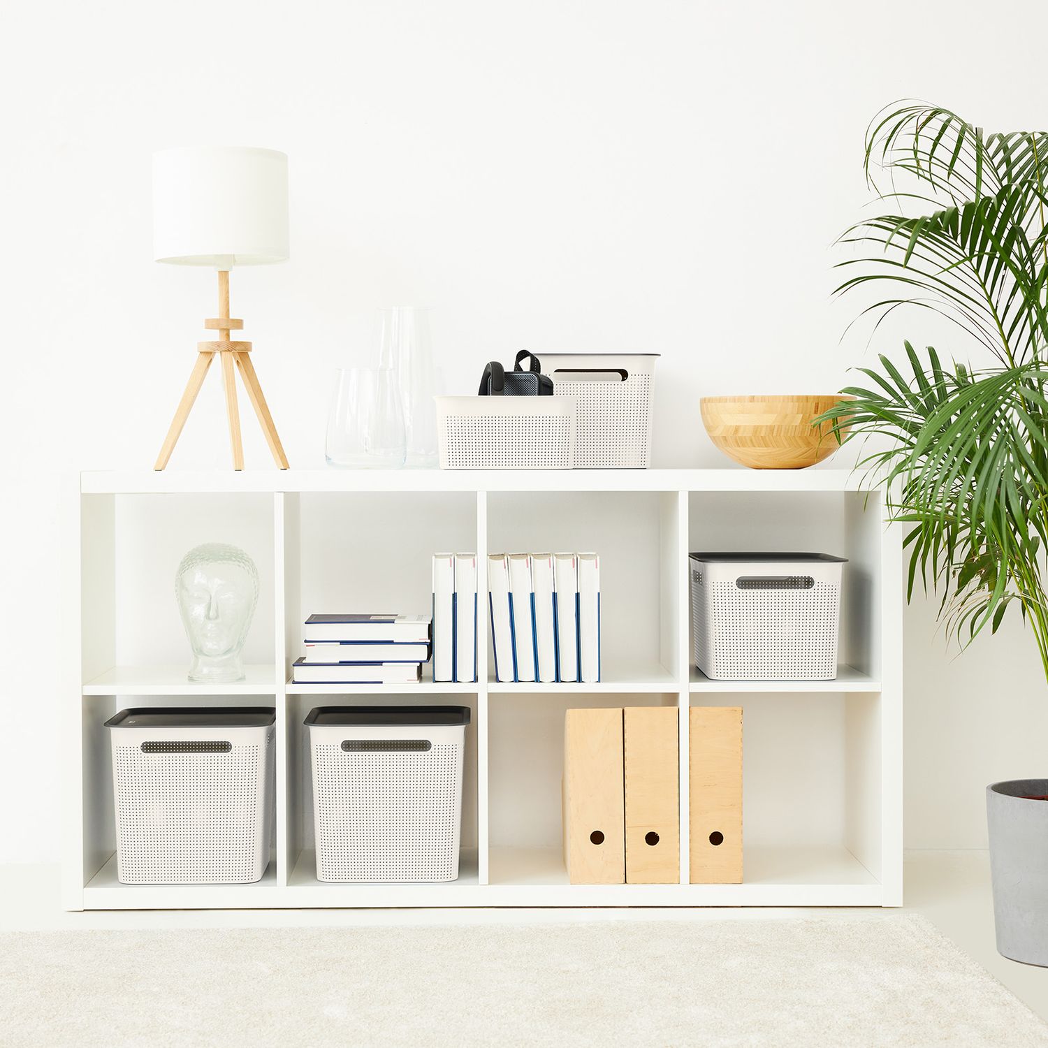 Sicher kennen Sie es auch, wenn Sie etwas suchen, es sich oftmals nicht an dem Ort befindet, an dem es eigentlich sein soll. Mit der Box 16 l BRISEN von Rotho und den anderen Aufbewahrungsboxen dieser Reihe können Sie zukünftig für Ordnung im eigenen Heim sorgen. Ob Sie darin Unterlagen, Dekoartikel oder Spielsachen der Kinder aufbewahren, ist Ihre Entscheidung. Dank der rechteckigen Form passt die Box perfekt in Regalsysteme verschiedener Möbelketten. Das Design der Aufbewahrungsbox ist zeitlos, aber dennoch ist sie formschön. Damit sind die Boxen problemlos in verschiedenen Bereichen einsetzbar. Die Ecken sind abgerundet, sodass auch für die Kleinsten keine Verletzungsgefahr besteht. Die Griffe der Box ohne Deckel sorgen für einen sicheren Transport.