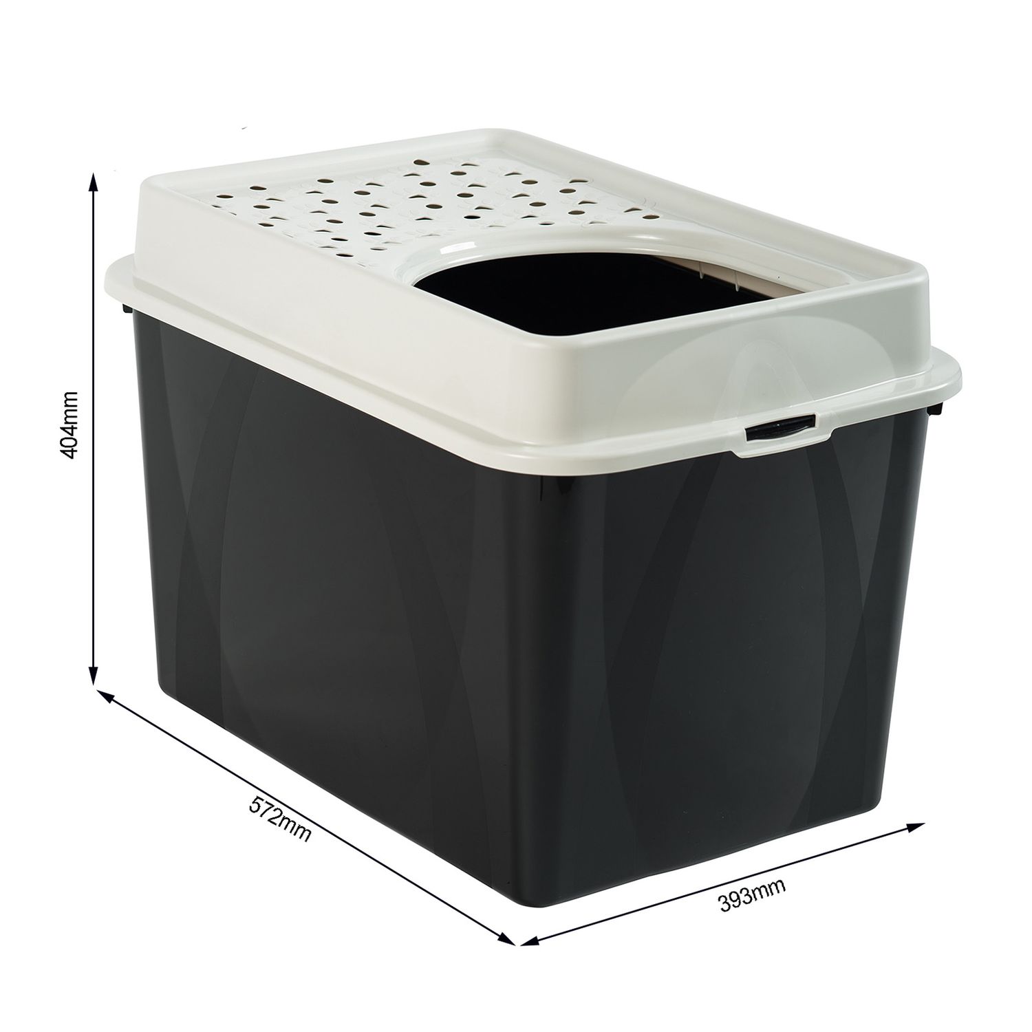 Die Rotho Katzentoilette BERTY bietet allen Komfort, den eine Katzentoilette bieten sollte. Besonders ist hier, dass sich der Einstieg auf der oberen Seite befindet. Die Öffnung und auch die Toilette sind groß genug, sodass auch größere Katzen hier wirklich ausreichend Platz haben, um ihrem Geschäft nachzugehen. Dadurch sind die Seitenwände hochgehalten, was wiederum den Vorteil hat, dass kein Katzenstreu seitlich austretet kann. Hat der Stubentiger noch Katzenstreu an den Pfoten, kann dieses durch die angebrachten Löcher an der Oberseite wieder in das Katzenklo hineinfallen. So sieht der Platz rund um die Katzentoilette Berty auch immer sauber aus.