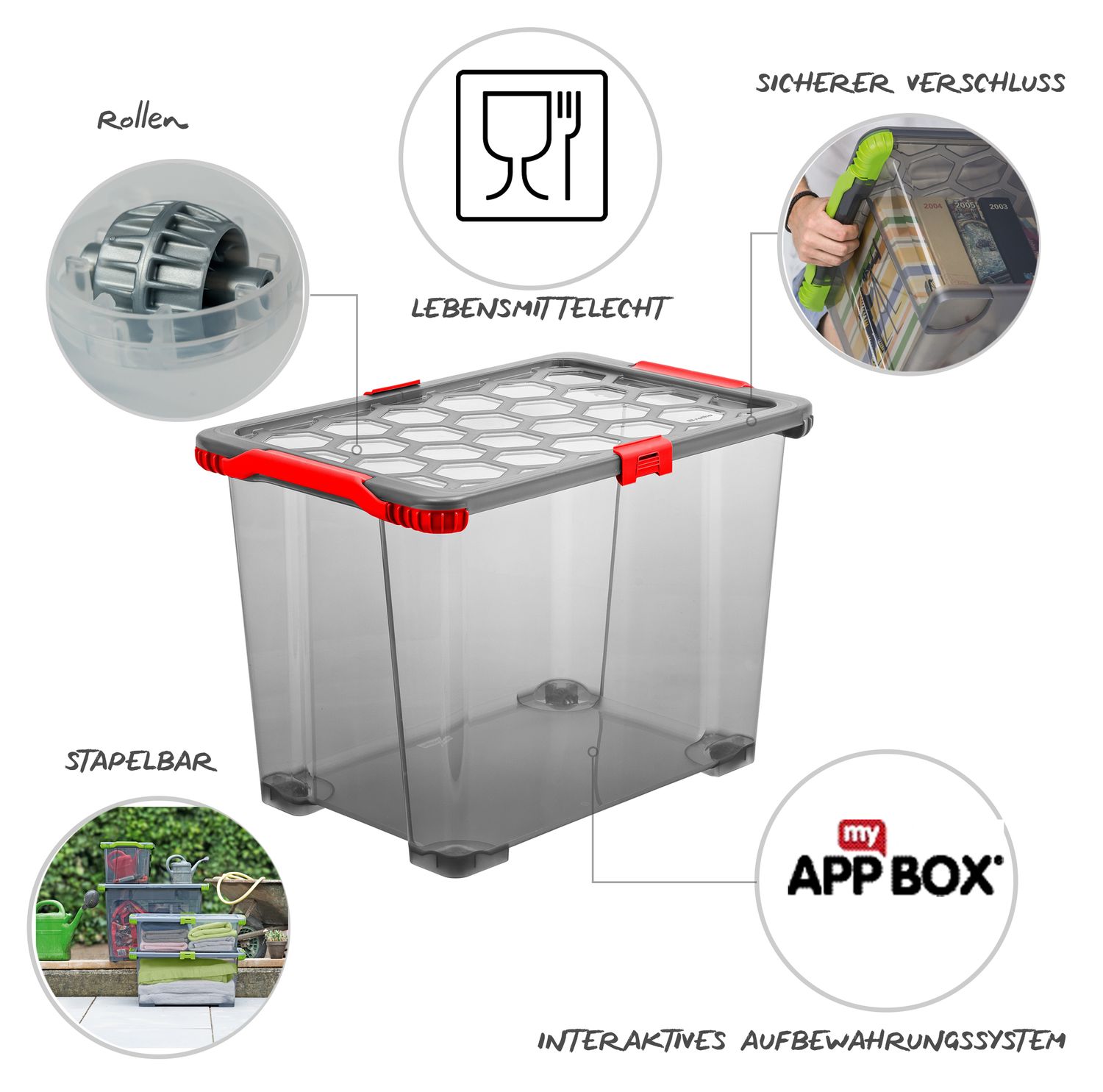 Die Serie EVO TOTAL PROTECTION wurde mit Dichtungen versehen, damit weder Schmutz noch Feuchtigkeit in die Box gelangen können. Um die Stabilität zu unterstützen, sind die Ecken mit Dämpfern versehen, die das Brechen verhindern sollen. Außerdem sind die Griffe besonders stabil. Damit kann die Box auch in vollem Zustand gut getragen werden. Möchten Sie nicht benutzte Boxen verstauen, können Sie sie ineinander stapeln, Boxen mit Deckel übereinander. Damit sparen Sie zusätzlich Platz. Diese und auch die Clear Boxen sollten in keinem Haushalt fehlen.