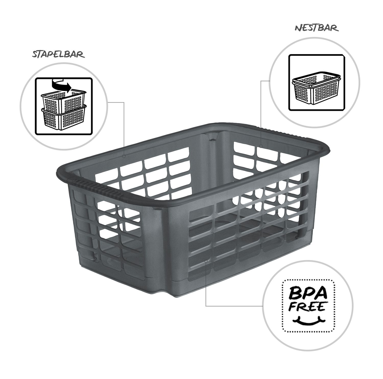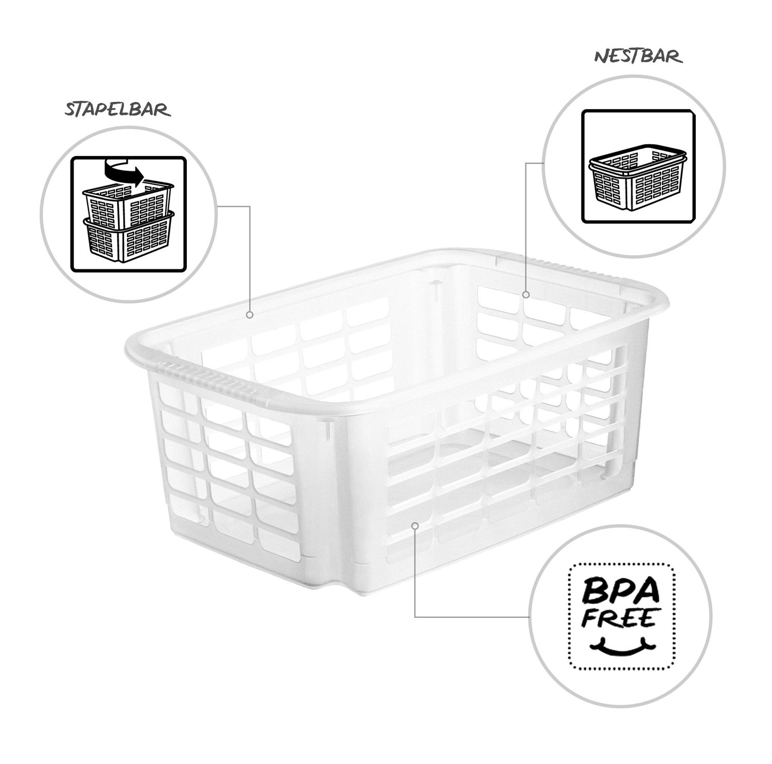 Das Stapelkörbchen REVERSO ist formschön, ästhetisch und vielseitig verwendbar. Die abgerundeten Ecken erweisen sich im alltäglichen Gebrauch als unfallresistent und kinderfreundlich. Durch die bequemen Griffe lässt sich das Körbchen komfortabel transportieren. Die moderne Gitterstruktur ermöglicht gute Luftzirkulation und einen ungehinderten Blick auf den Körbcheninhalt. Die REVERSO Serie besteht aus einem kleinen, einem mittleren und einem großen Stapelkorb, die sich bequem und passgenau im jeweils nächstGrößeren Modell verstauen lassen.