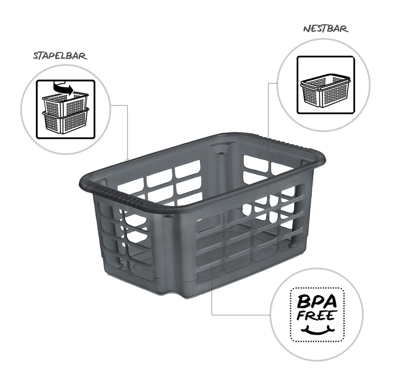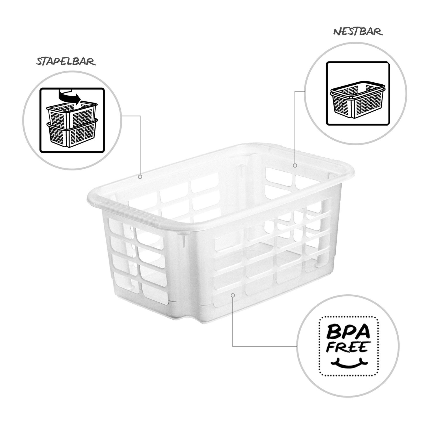 Das Stapelkörbchen REVERSO ist formschön, ästhetisch und vielseitig verwendbar. Die abgerundeten Ecken erweisen sich im alltäglichen Gebrauch als unfallresistent und kinderfreundlich. Durch die bequemen Griffe lässt sich das Körbchen komfortabel transportieren. Die moderne Gitterstruktur ermöglicht gute Luftzirkulation und einen ungehinderten Blick auf den Körbcheninhalt. Die REVERSO Serie besteht aus einem kleinen, einem mittleren und einem großen Stapelkorb, die sich bequem und passgenau im jeweils nächstGrößeren Modell verstauen lassen.