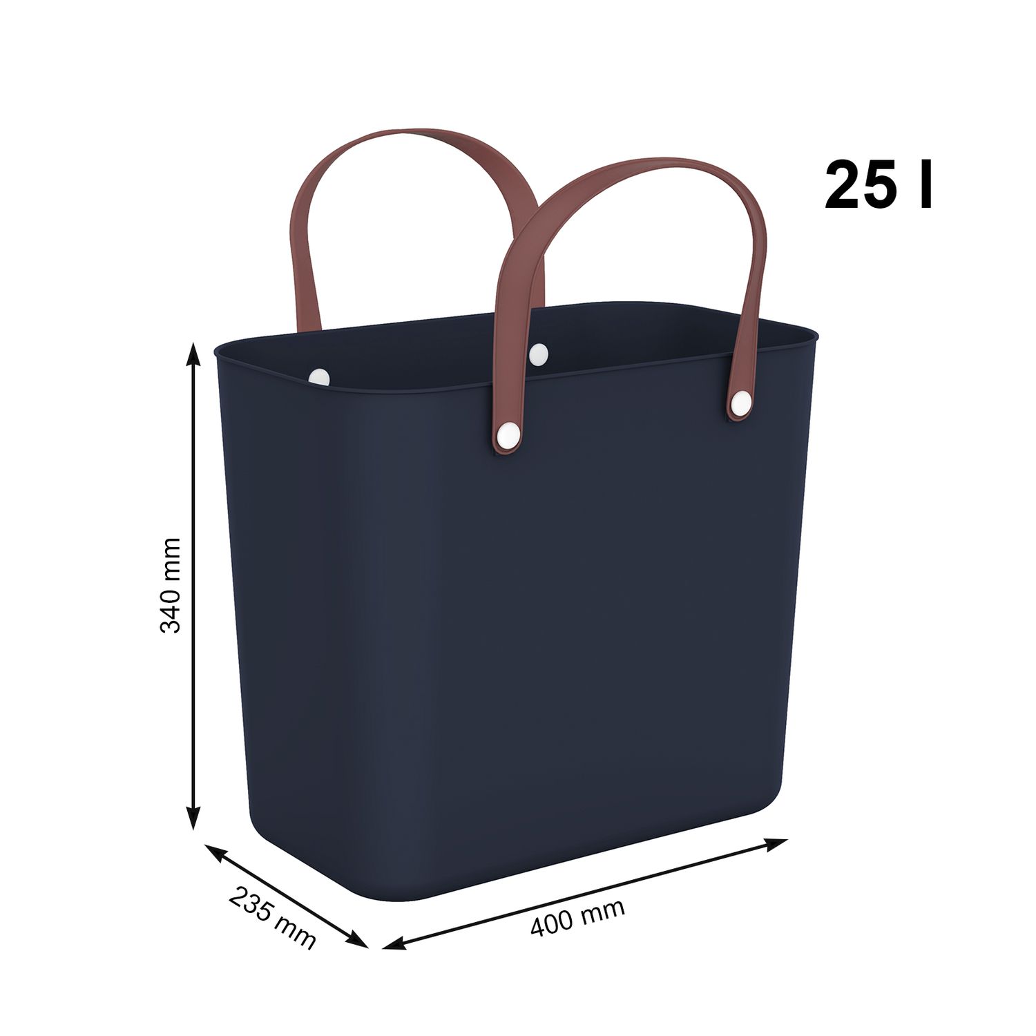 Mit ihrem Fassungsvermögen von 25 Litern bietet die Einkaufstasche aus Plastik viel Platz. Die ergonomischen Griffe halten einem Gewicht von bis zu 40 kg stand und dank des abgerundeten Designs und des pflegeleichten Materials ist die Tasche aussen sowie innen sehr leicht zu reinigen. Die Produkte sind nachhaltig produziert und aus recyceltem Material hergestellt.