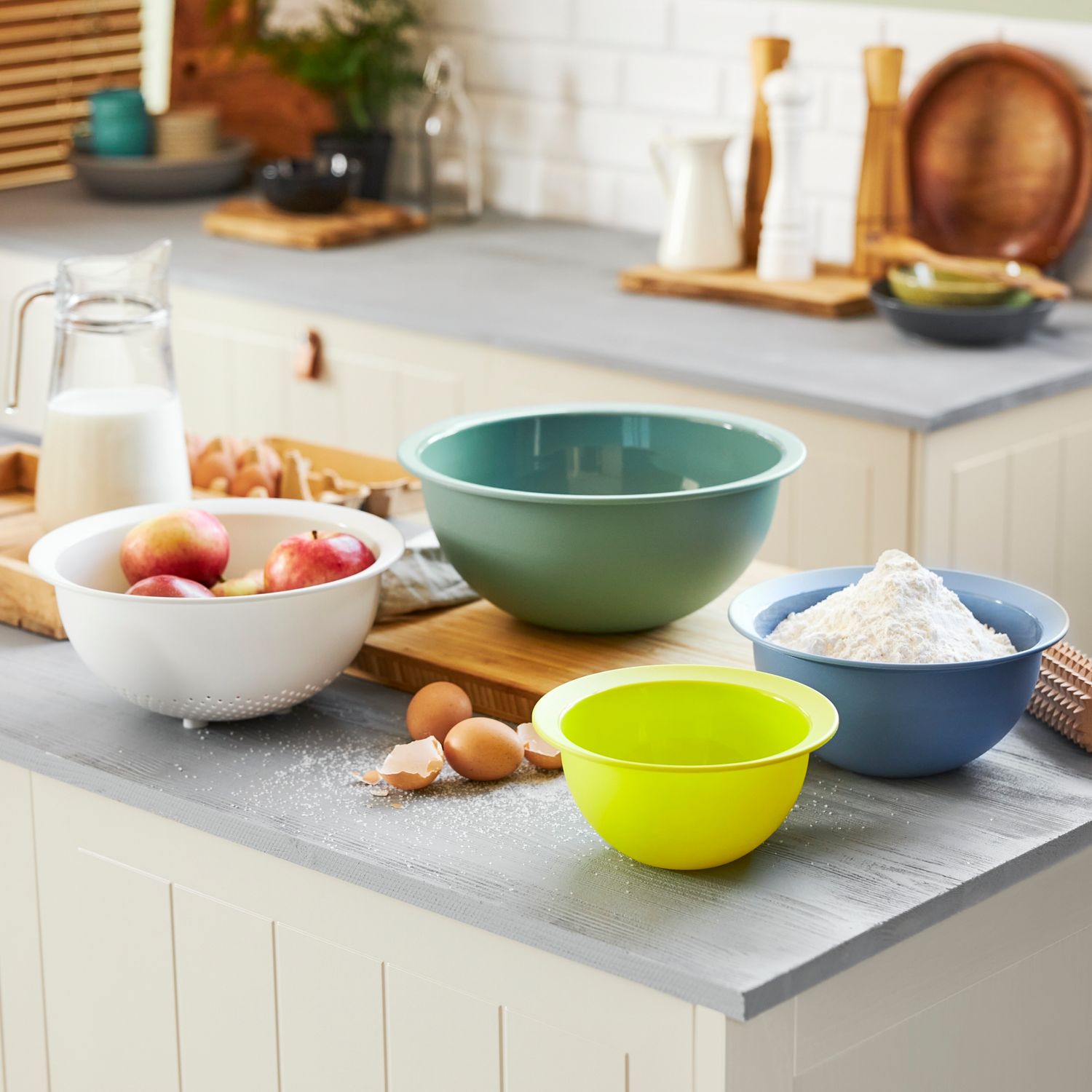 In diesem farbenfrohen Set finden Sie platzsparend verstaut alles für den täglichen Gebrauch, was Sie an Schüsseln und Sieb brauchen. Alle Basics für den täglichen Bedarf vereint - das ist das platzsparende und formschöne Schüssel-Siebset. Set mit 3 Schüsseln und einem Sieb - praktisch und schön Die gerundete Form der Schüssel ist nicht nur zum Kneten von Teig ideal. Zusammen mit dem Sieb erlaubt sie ein direktes Servieren von Salat und Pasta von der Küche direkt auf den gedeckten Tisch.