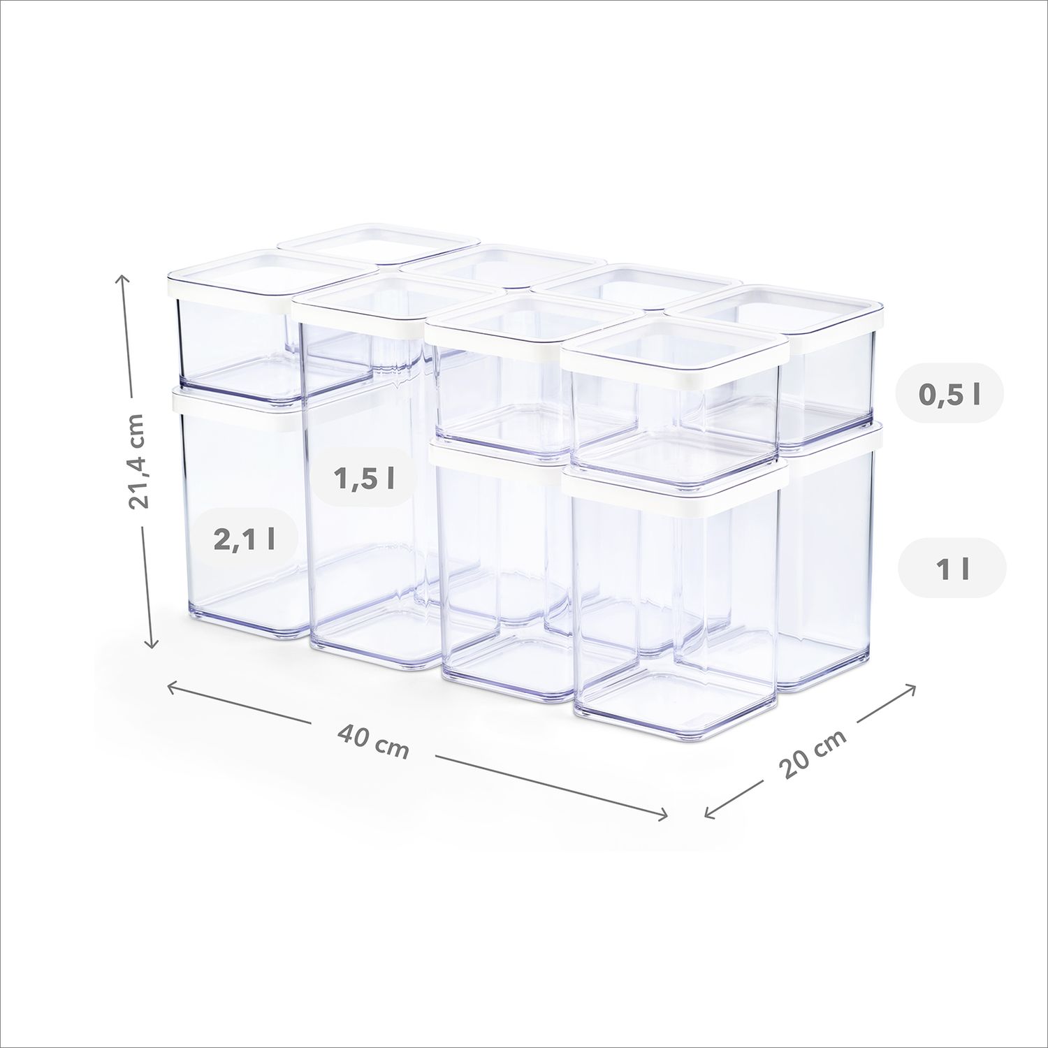 • Lieferumfang: 12-tlg. Aufbewahrungsboxen-Set inkl. 12x Deckel, 40×20×21,4 cm (L×B×H), Unterteil und Deckel transparent, Dichtungsring - 5x 0,5 l, 3x 1,0 l, 3x 1,5 l, 1x 2,1 l