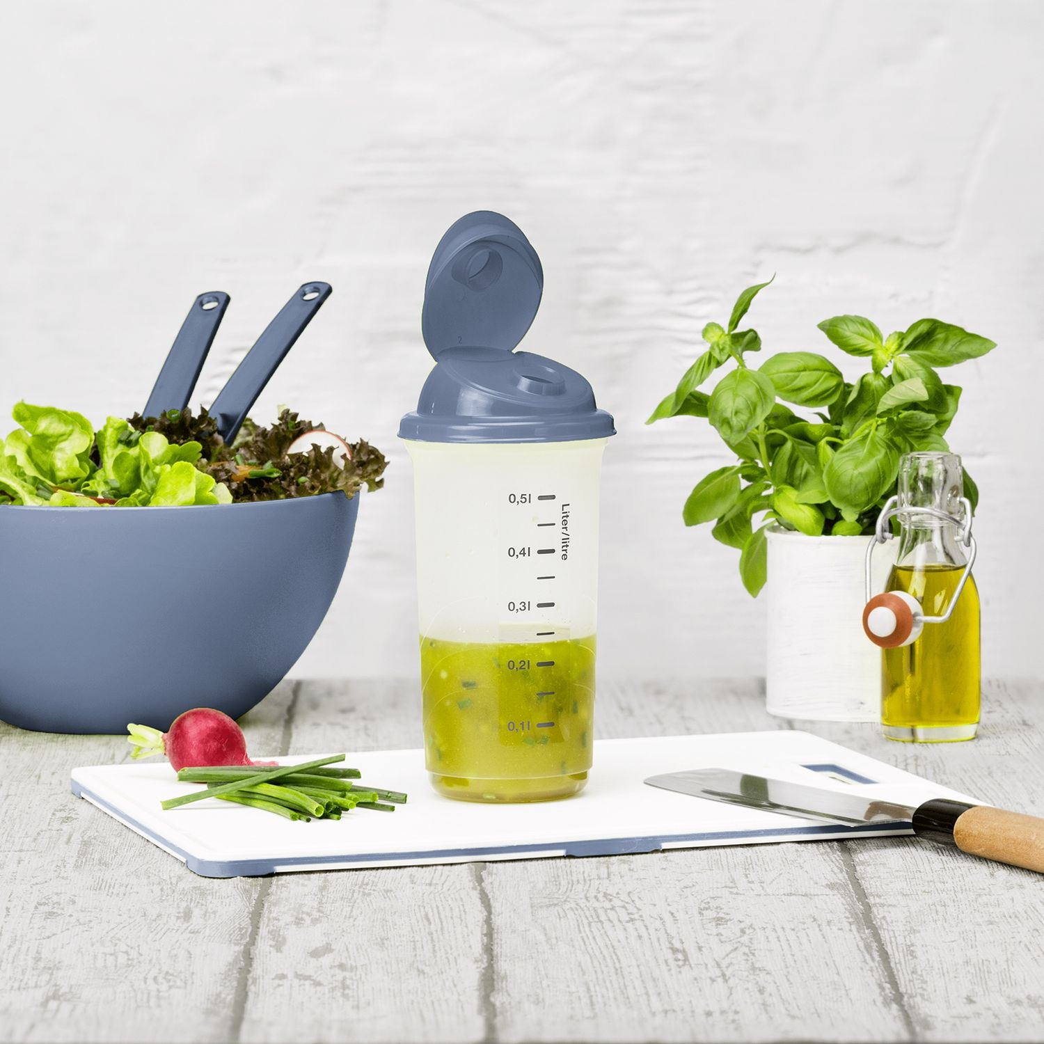 Der transparente Becher hat ein Volumen von 0.6 l und ist mithilfe eines Deckels mit integriertem Ausguss transportsicher zu verschließen. Dank der leicht ablesbaren Messskala lassen sich Dressings oder Getränke direkt im Becher zubereiten, ein Mixrad sorgt für optimale Durchmischung. Der Becher besteht aus robustem, hochwertig verarbeitetem Kunststoff, der umweltfreundlich erzeugt wird und keinerlei Schadstoffe enthält. Er ist pflegeleicht und spülmaschinengeeignet. Nutzen auch Sie diesen flexibel einsetzbaren Shaker, der gesunde Ernährung kinderleicht macht!