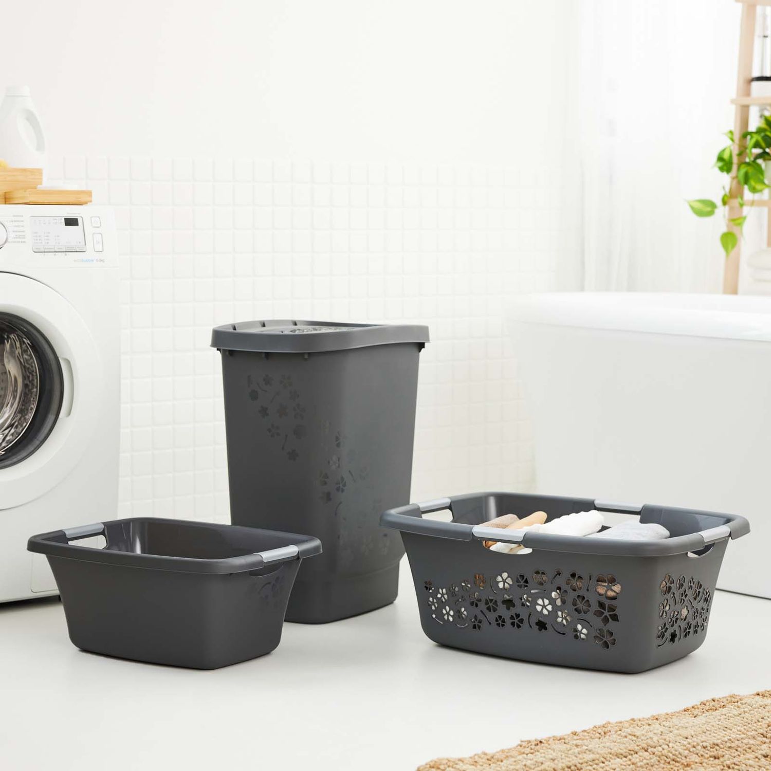 Der Wäschesammler FLOWERS verbirgt unschöne Wäscheberge vor den Augen von Besuchern und wird dank seines originellen Blumenmusters zum attraktiven Blickfang im Badezimmer. In dem hohen, schlanken Behälter lässt sich richtig viel Wäsche verstauen, zugleich passt er in jede Nische - optimal, wenn das Platzangebot im Bad beschränkt ist. Der innovative Deckel verfügt über eine Schwing- sowie eine Kippfunktion, sodass Sie Ihre Wäsche bequem mit nur einer Hand in die Tonne befördern können. Zum Entleeren des Wäschesammlers lässt sich der Deckel auch ganz abnehmen. Dank seiner zwei integrierten Tragegriffe bleibt der Behälter mobil, selbst wenn er voll befüllt ist. Damit unangenehme Gerüche gar nicht erst entstehen können, sorgen Durchbrüche im Blumenmuster für Luftzirkulation.