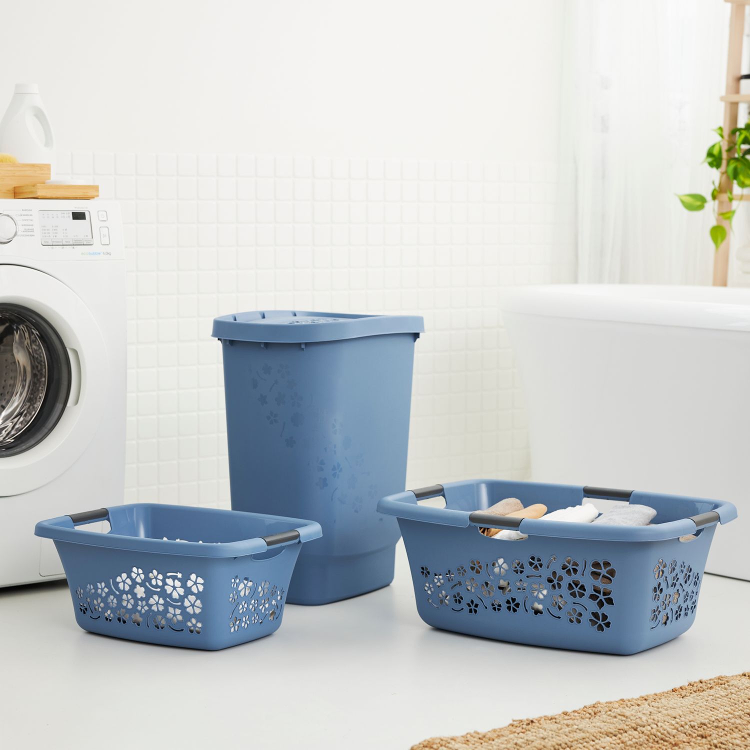 Der Wäschesammler FLOWERS hat ein Fassungsvermögen von 55 l und besteht aus robustem, hochwertig verarbeitetem Kunststoff. Er ist mit einem abnehmbaren Deckel ausgestattet, der über eine Kipp- sowie eine Schwingfunktion verfügt. Zwei integrierte Tragegriffe erlauben einen bequemen Transport des Behälters, Durchbrüche im Deckel sowie im Boden sorgen für eine Belüftung des Inhalts. Das dekorative Blumenmuster wertet den Wäschesammler optisch auf und unterscheidet ihn von herkömmlichen Wäschekörben. Der praktische Haushaltshelfer ist in mehreren attraktiven Farbvarianten erhältlich - bringen Sie frischen Wind in Ihr Badezimmer und sammeln Sie Ihre Schmutzwäsche diskret und platzsparend!